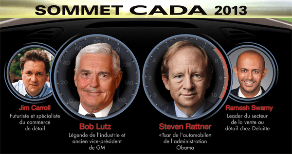 Des personnalités des deux côtés de la frontière seront au centre des débats du Sommet de la CADA 2013, un événement annuel sur l’apprentissage et le réseautage mis sur pied par la Corporation des associations de détaillants d’automobiles (CADA) et qui a lieu le 13 février 2013 à l’hôtel Hilton de Toronto.