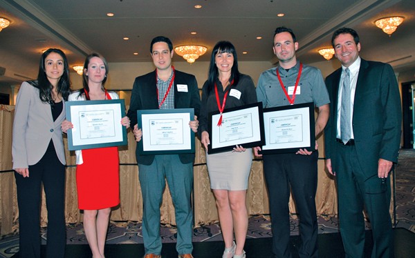 Quelques diplômés présents à la cérémonie de remise de certificats du « Programme de Perfectionnement CCAM-NADA » : Lamis Salam, directrice de la Formation et Services-conseils en ressources humaines de la CCAM; Geneviève Lauzon, de Volkswagen St-Eustache; Johnny Evangelista, Avantage Ford; Sonia Drolet, Hyundai Vaudreuil; Sébastien Di Mauro, Longueuil Kia; et Stéphane Guilbault, président sortant de la CCAM