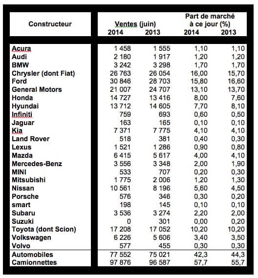 General Motors, après avoir connu des gains modestes au début de l’année, a vu la demande diminuer légèrement en juin — 21 007 véhicules pour une baisse de 15 % par rapport à la même période de 2013, malgré une pléthore de nouveaux modèles ou de modèles redessinés dans sa gamme cette année.