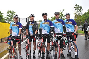L’équipe du 1 000 kilomètres du Groupe PPP à son arrivée au Stade Olympique : Bernard Dallaire, Financière Banque Nationale ; Martin Bédard, La Capitale ; Daniel Boudreault, de l’émission Virage Télémag et FM93 ; Yves Allard, Nissan Île Perrôt et St-Constant Hyundai ; et Mario Champagne, Groupe PPP (Crédit photo: TELAIO par Marie-Josée Leclerc)