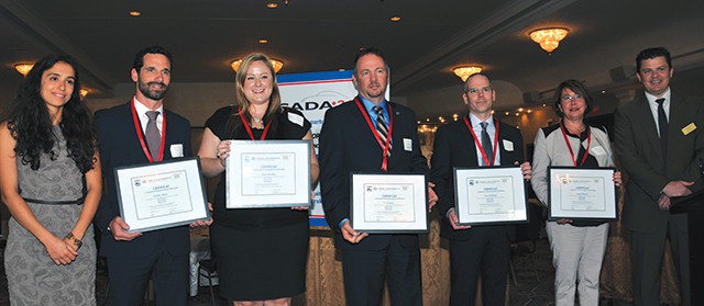 Lamis Salam, directrice, Formation, CCAM; Frédéric Morin, Sherbrooke Audi; Fannie Gaudette, Montréal Chrysler Dodge Jeep Ram Lasalle; Luc Fournier, Park Avenue Nissan Brossard; Dave Ducharme, Joliette Nissan; Paule Bergeron, St-Constant KIA; et Joël Levac, président sortant de la CCAM