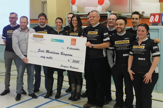 Le 4 décembre dernier, quelques membres de l’équipe de cyclistes de la CCAQ, qui ont réalisé La Boucle 2015 dans le cadre du Grand défi Pierre Lavoie, ont procédé à la remise d’un chèque au montant de 5 000 $ à M. Maxime Pilote, directeur de l’école Madeleine Bergeron, de Québec.