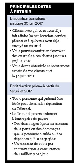 Outre les destinataires avec lesquels vous avez une relation d’affaires en cours au sens de la Loi ou qui vous ont déjà donné leur consentement exprès, vous pouvez continuer d’écrire aux destinataires avec lesquels vous avez déjà eu une relation d’affaires par le passé et à qui vous avez déjà envoyé une communication électronique (avant le 1er juillet 2014), et ce, jusqu’au 30 juin 2017.