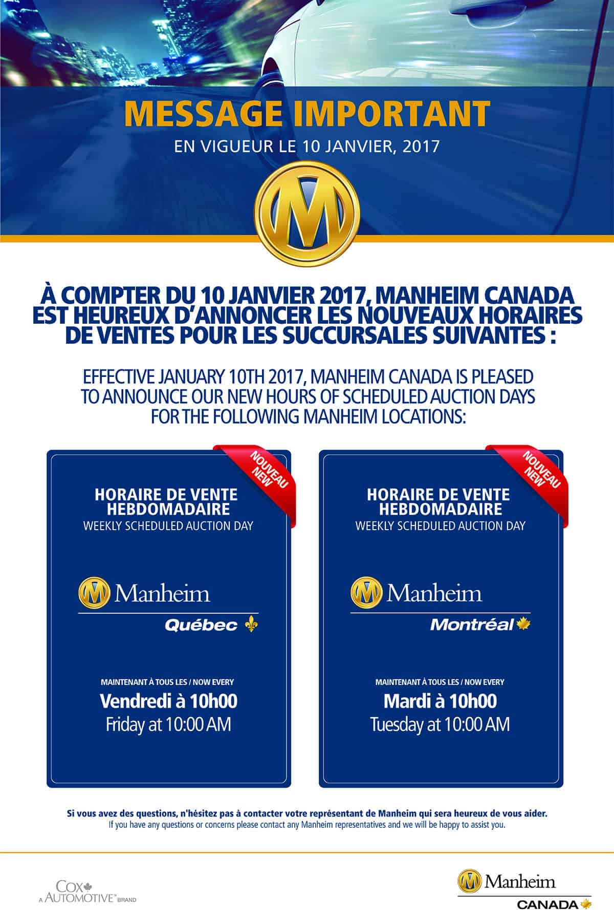 Manheim Canada est heureux d’annoncer de nouveaux horaires de vente pour les succursales de Québec et de Montréal, et ce, à compter du 10 janvier 2017.