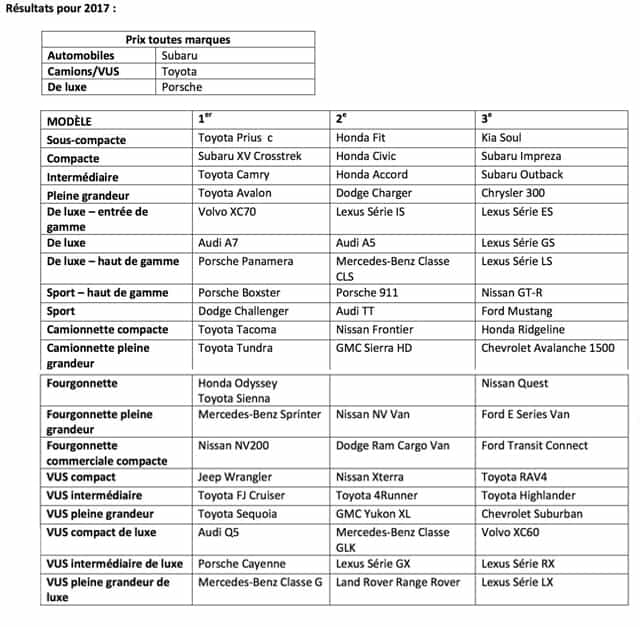 Le nouveau «Prix de la Marque par Excellence» Canadian Black Book pour la meilleure valeur retenue dans la catégorie Automobiles a été décerné à Subaru. Dans la catégorie des Camions/VUS, le gagnant est Toyota et dans la catégorie De luxe, c’est Porsche qui l’emporte.