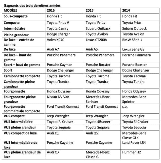 «Après une décennie de présentation de ces prix, nous avons déterminé qu’il fallait reconnaître les marques qui excellent vraiment en termes de valeur retenue, pour tous leurs produits», explique Brad Rome, président, Canadian Black Book. «Cela dit, notre priorité en octroyant ces prix, c’est de mieux renseigner les consommateurs à savoir quels sont les modèles et les marques offrant la meilleure occasion d’économiser à long terme.»