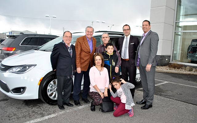 Jacques Demers, directeur général, Coop publicitaire des concessionnaires Chrysler, Jeep Dodge du Québec; Michel Gaudette, président, Salon international de l’auto de Montréal (SIAM); M. Nacer Zenia, sa conjointe, Hamdi Hassina, ainsi que ses deux enfants; Philippe Demers, directeur régional, FCA Canada, et Luis Pereira, directeur du SIAM