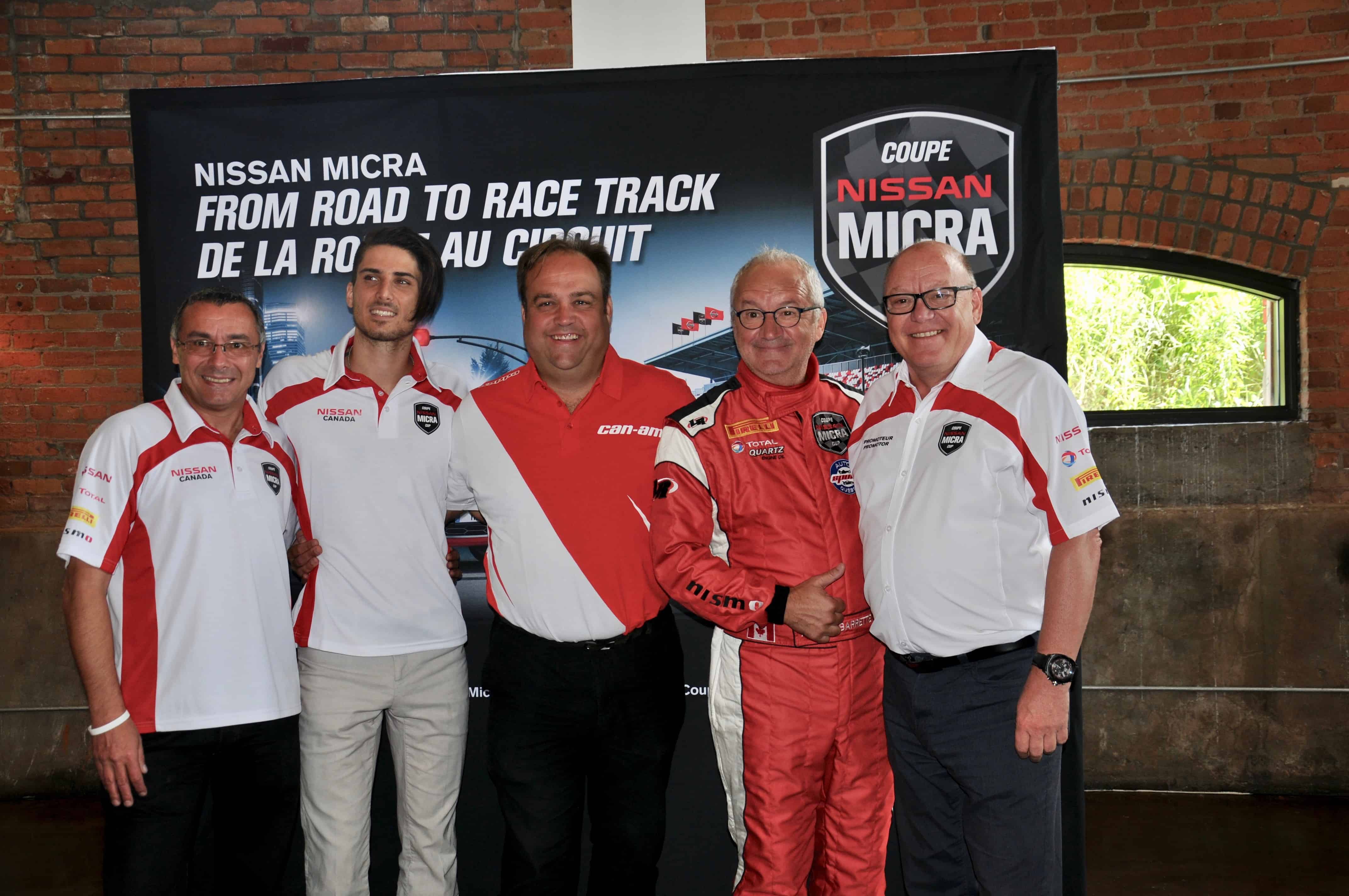 Didier Marsaud, directeur principal, communications d’entreprise, Nissan Canada; Kevin Bazinet; Dominic Fugère, directeur général, Grand Prix de Trois-Rivières; Michel Barrette et Jacques Deshaies, promoteur, Coupe Nissan Micra