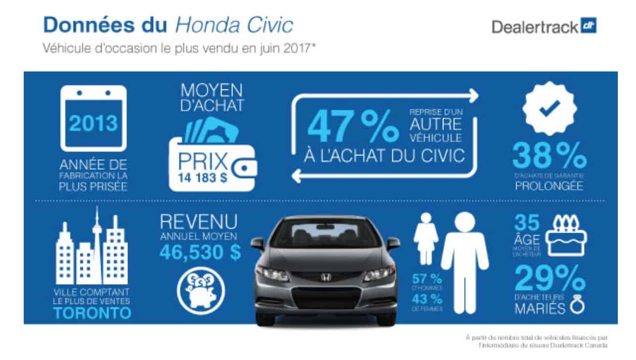 Selon la liste des véhicules les plus financés en juin dernier, ce serait la camionnette pleine grandeur RAM 1500 qui arrive en tête, suivie de la berline compacte Honda Civic. Cette dernière est d’ailleurs la seule voiture dans le top 5, soit parmi les Dodge Grand Caravan, Ford F 150 et le VUS compact Ford Escape.