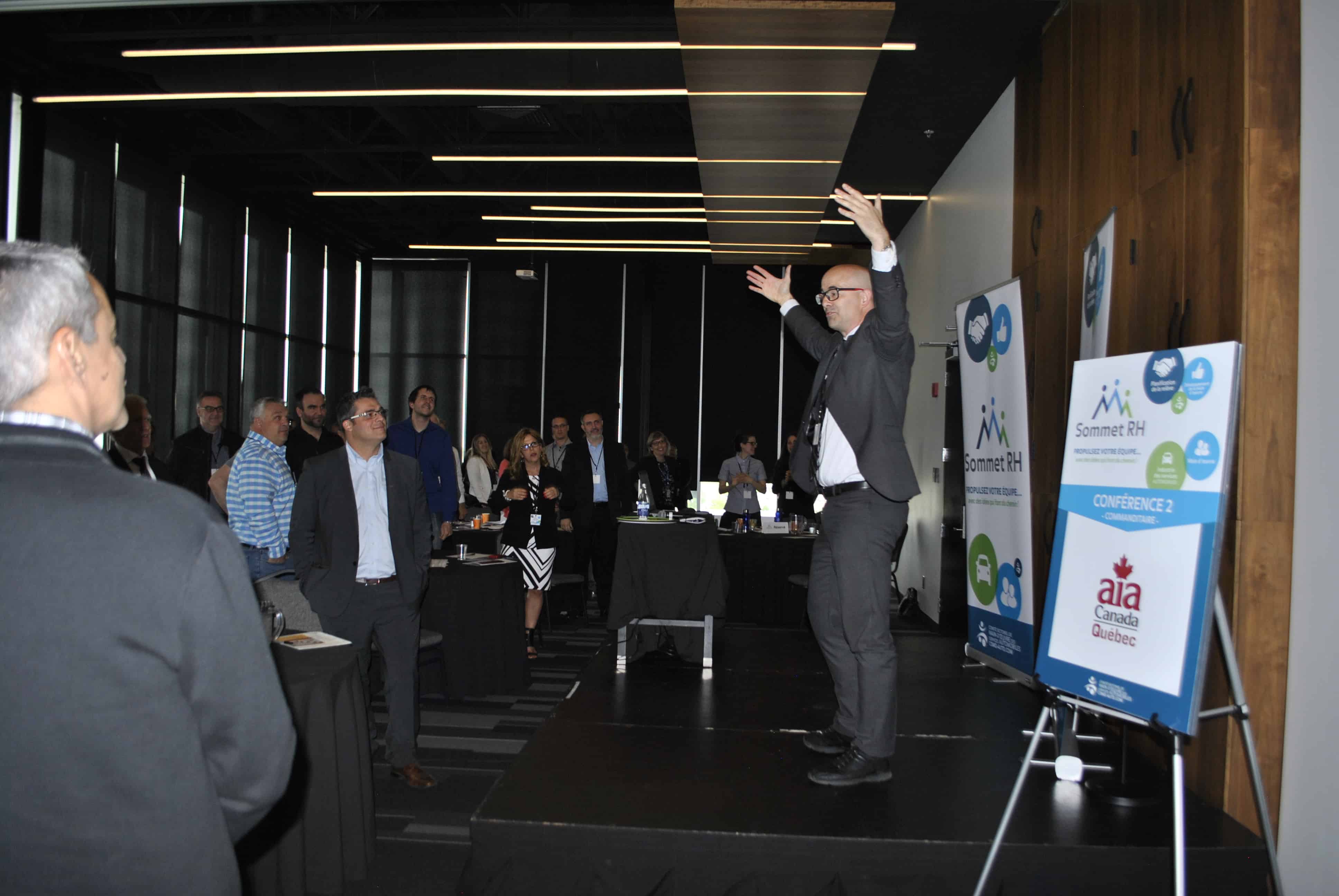 La première conférence de la journée a été celle de Richard St-Pierre, économiste de formation et directeur général chez Emploi-Québec. Ses propos étaient axés sur le marché du travail au Québec et faisaient état, en chiffres et en faits, de bilans et de perspectives. Il a ensuite parlé du niveau de vie, de la productivité et du capital humain au Québec, en plus des déséquilibres du marché.