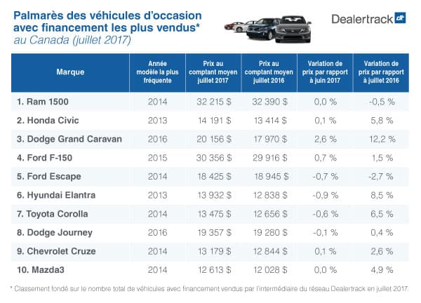 Sur le plan du volume de ventes, le Ram 1500 trône toujours au sommet du classement des véhicules d’occasion financés. Comparativement à juillet 2016, son volume de ventes a augmenté de 30 %, pour un prix moyen au comptant de 32 215 $. Le seul autre véhicule à le surpasser sur ce plan a été l’Escape, avec une hausse de 32,7 %. La camionnette pleine grandeur Ford F 150, en quatrième position, a connu la plus importante baisse de volume annuelle, soit 6,2 %.