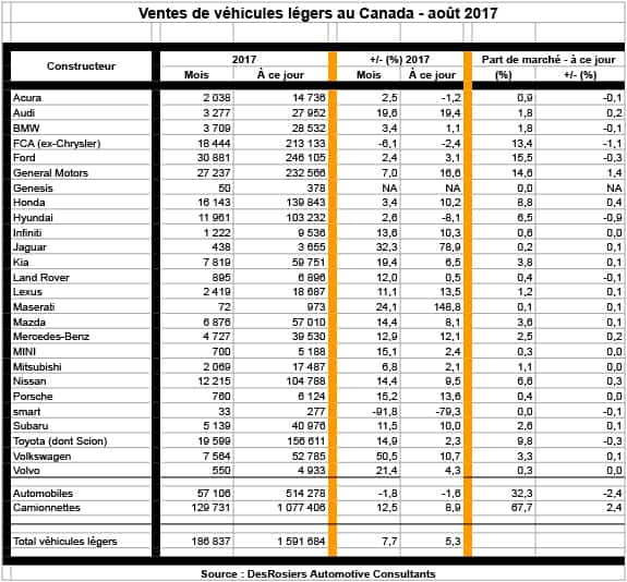 Les ventes de camionnettes, y compris les VUS, ont augmenté de 12,5 % avec 129 731 véhicules vendus en septembre ; pour ce qui est des automobiles, leurs ventes ont baissé de 1,8 % avec 57 106 véhicules. Dennis DesRosiers fait remarquer que « chacun des mois de 2017 a connu un record de ventes de camionnettes ; cependant, les ventes d’automobiles sont restées sous les records établis dans les années 1980. »