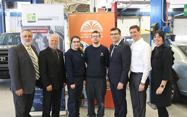 M. Sylvain Blais, président du Conseil régional des partenaires du marché du travail de l’Abitibi-Témiscamingue, M. Gaétan Gilbert, président de la Commission scolaire de l’Or-et-des-Bois, Sarah Godin et Nicolas Menardais, deux élèves du programme de mécanique automobile, M. Jason Yergeau, directeur du Centre de formation professionnelle Val-d’Or ainsi que M. Sébastien Roy et Mme Patsy Deschênes, représentants de la Corporation des concessionnaires d’automobiles du Nord-Ouest.