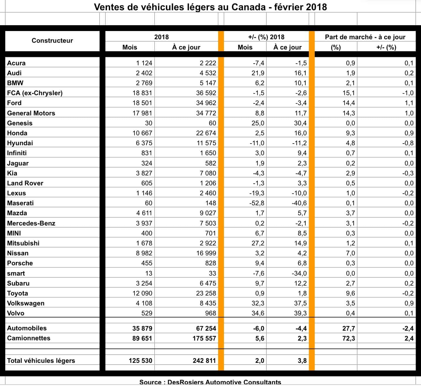 Les ventes de 125 530 véhicules de février étaient à la hausse de 2 % par comparaison au même mois record de l’année précédente, ce qui a amené le total à ce jour pour l’année à 242 811 véhicules, une augmentation de 3,8 %. Elles étaient 12 % plus élevées que la moyenne du mois des cinq dernières années, selon David Adams, président de Global Automakers of Canada.