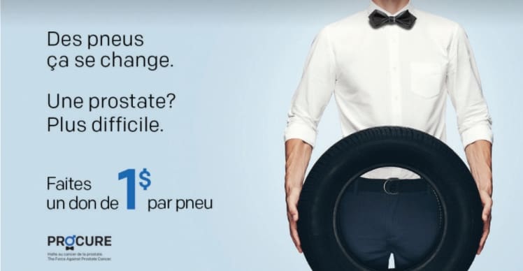 Saviez-vous que, chaque jour au Québec, 12 hommes reçoivent un diagnostic de cancer de la prostate ? L’organisme PROCURE est le seul organisme de bienfaisance au Québec entièrement consacré à la lutte contre ce cancer. Afin de sensibiliser la population et de recueillir des dons, les gens de PROCURE ont eu la brillante idée de faire de la saison automnale du changement de pneu un moment consacré à lutter contre ce cancer. Du 15 octobre au 1er décembre 2018, les employés des concessions sont donc invités à solliciter leurs clients à faire un don de 1 $ par pneu changé. La récolte des fonds se fera par l’ajout d’un montant de 4 $ à la facture de leurs clients. Même si cette campagne n’aura lieu qu’en novembre, les concessionnaires sont invités à s’inscrire dès maintenant.