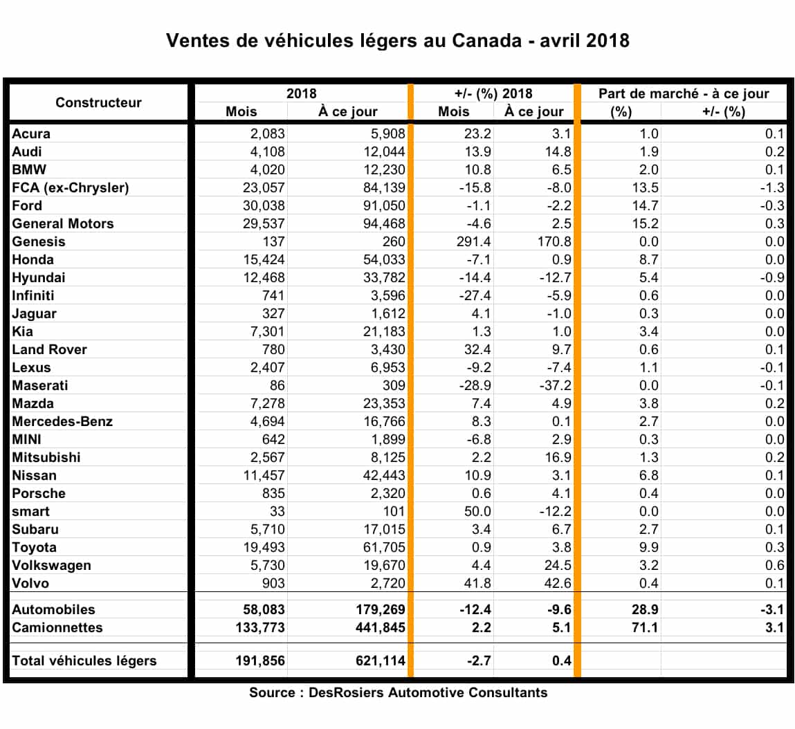 À ce jour, l’année 2018 s’aligne sur des ventes record avec 621 114 véhicules, 0,4 % en avance sur l’an dernier. Cependant, le taux annuel désaisonnalisé d’avril (TAD) se situait à 1,95 million de véhicules, selon DAC – le deuxième plus bas niveau en 15 mois ; et c’est aussi la deuxième fois depuis avril de l’an dernier qu’il descend sous les 2 millions.