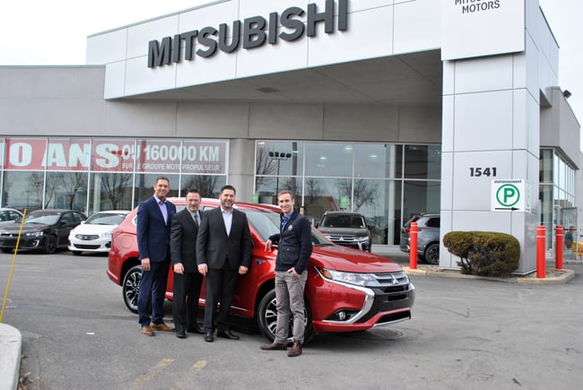 Le gagnant, Cédric Robillard, accompagné de M. Luis Pereira, directeur général du Salon international de l’auto de Montréal, de M. John May, directeur régional des Ventes chez Mitsubishi Canada et de M. Dany Lemelin, propriétaire de Boucherville Mitsubishi et président du Salon international de l’auto de Montréal.