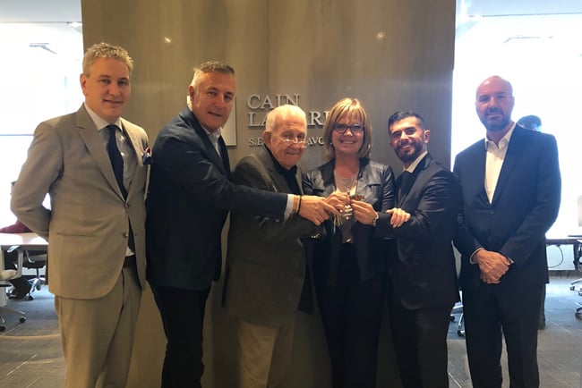 Marc Tremblay, Ing, Avocat associé, Cain Lamarre ; Charles et Raymond Gref, anciens propriétaires ; Manon Messier, Conseillère principale, fusions & acquisitions ; Jimmy Azouz, Groupe Azouz – nouveau propriétaire et Richard Danis, CPA, CA, Hénaire Danis Brunet SENCRL