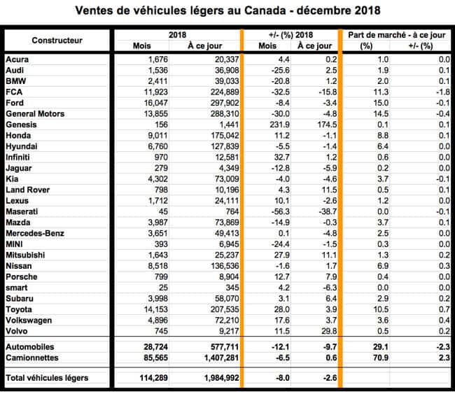 Cependant, une baisse de 8,4 % des ventes chez Ford en décembre a limité son total annuel à 297 902 véhicules, soit une baisse de 3,4 % par rapport à 2017, entraînant une perte de part de marché de 0,1 %, à 15 %.