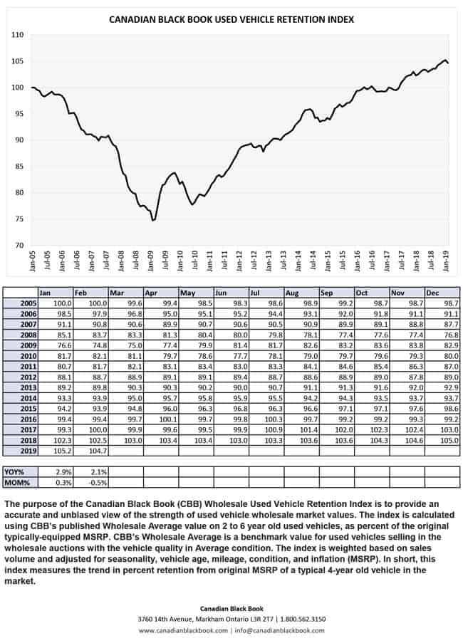 Le Canadian Black Book (CBB) vient de publier son indice mensuel de rétention des véhicules d’occasion au Canada pour le mois de février 2019. Et, c’est une baisse qui a été enregistrée…