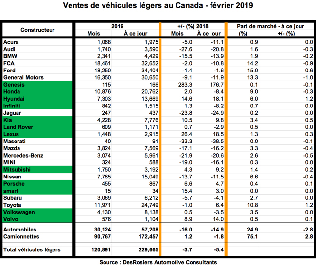 Les ventes de 16 350 véhicules de General Motors en février représentent une diminution de 9,1 %, reléguant GM à la troisième place du classement pour le mois et l’année. Les ventes de 30 650 véhicules depuis le début de l’année ont diminué de 11,9 %, ce qui réduit sa part de marché de 1 %, à 13,3 %. Toyota occupe toujours la quatrième place avec 11 971 véhicules vendus, en baisse de 1 % par rapport à février 2018. Depuis le début de l’année, ses ventes s’élevaient à 24 749 véhicules, en hausse de 6,4 % par rapport à l’année précédente, ce qui hausse sa part de marché de 1,2 % à 10,8 %, la plus haute de l’industrie (à égalité avec Hyundai). Honda, avec 10 876 véhicules vendus en février, était le seul constructeur parmi les cinq premiers à avoir augmenté ses ventes par rapport à 2018 – de 2 %. Depuis le début de l’année, les 20 762 ventes cumulées de Honda représentent une diminution de 8,4 %, ce qui réduit sa part de marché de 0,3 %, à 9 %.