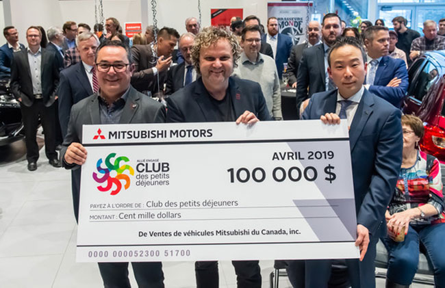 Pour souligner l‘ouverture officielle, Ventes de véhicules Mitsubishi du Canada inc. a remis son don annuel de 100 000 $ au Club des petits déjeuners, un organisme caritatif dévoué à aider les enfants à atteindre leur plein potentiel avec l’aide d’un déjeuner nutritif avant chaque jour d’école. Daniel Germain, président et fondateur du Club des petits déjeuners, était présent pour recevoir le don.