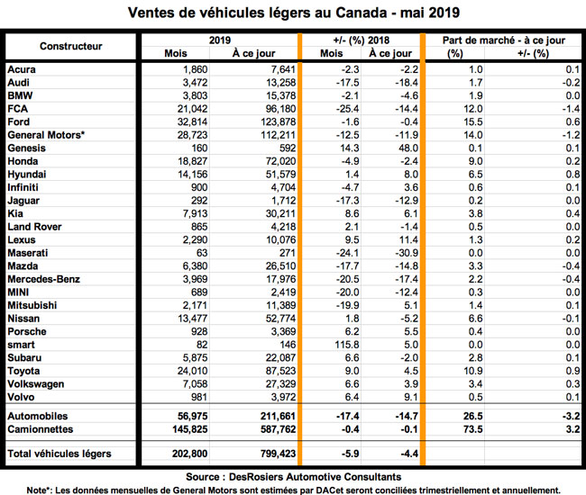 Il convient de noter que les chiffres de ventes totales du marché indiqués ici constituent une estimation de DesRosiers Automotive Consultants (DAC), compte tenu de la décision récente de General Motors de ne déclarer ses ventes effectives que sur une base trimestrielle. Les résultats mensuels estimés seront conciliés tous les trimestres afin de refléter les ventes effectives quand GM communique officiellement ses résultats.