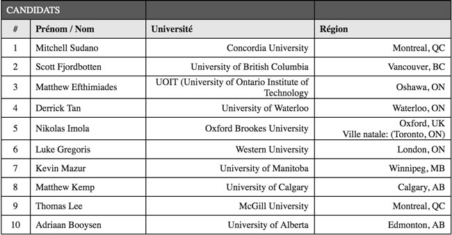 Les 10 finalistes de cette année sont des étudiants venus de l’ensemble du Canada, en particulier de Colombie-Britannique, de l’Alberta, du Manitoba, de l’Ontario et du Québec.