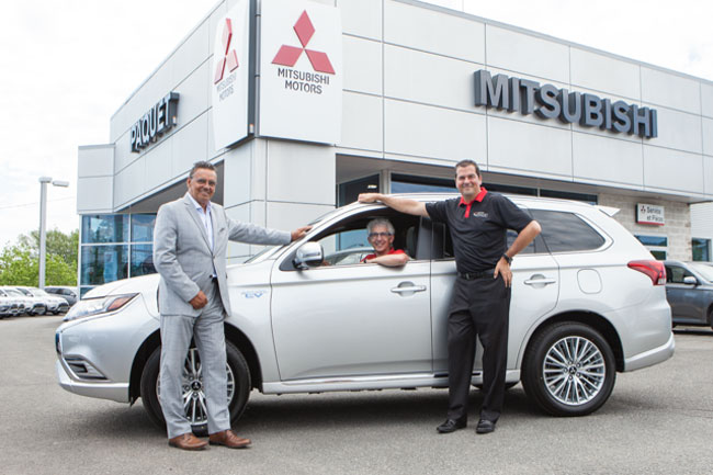 M. Lacasse, assis dans le Outlander PHEV ; Daniel Dallaire, directeur régional, Province de Québec, Ventes de véhicules Mitsubishi du Canada, inc. et de Donald Marcotte, directeur des ventes, Paquet Mitsubishi.