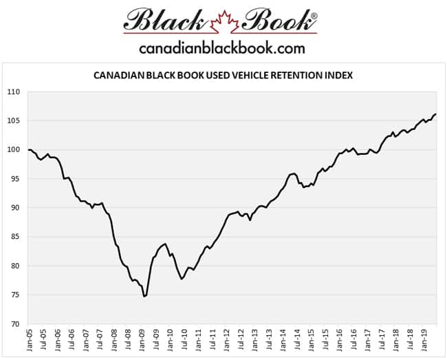 L’indice canadien de rétention de la valeur de revente des véhicules d’occasion du Canadian Black Book a atteint un nouveau record. Pour juin, on a atteint 106, soit 31 points de plus que le record atteint en juin 2010. La faiblesse du dollar canadien et la forte demande des deux côtés de la frontière continuent de créer des conditions propices aux gains du marché.