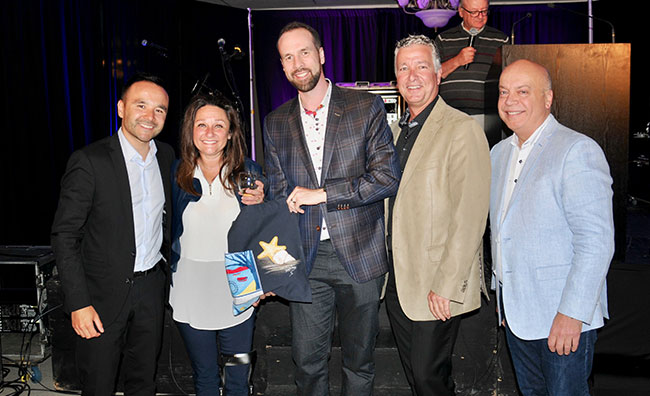 Ian P. Sam Yue Chi, vice-président, CCAQ, Linda Nadon, magazine Affaires automobiles, qui a reçu un bel hommage, et des produits du terroir de la région de Sept-Îles en cadeau, Jean-Michel Simard, président du C.A. de la CCAEQ, Gilles Poirier, président du C.A. de la CCAQ et Robert Poëti PDG de la CCAQ