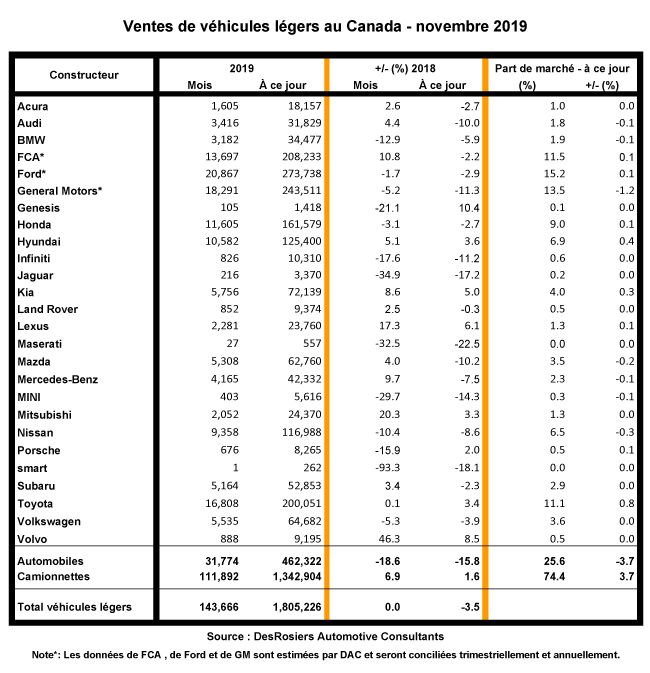 Il convient de noter que les chiffres des ventes totales du marché indiqués ici sont maintenant estimés par DesRosiers Automotive Consultants (DAC), étant donné que Fiat Chrysler Automobile, Ford et General Motors ne publient désormais leurs ventes effectives que sur une base trimestrielle. Les résultats mensuels estimés sont conciliés tous les trimestres par DAC afin de refléter les ventes effectives réalisées par les sociétés.
