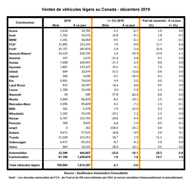 Il convient de noter que les chiffres des ventes totales sur le marché indiqués ici sont désormais estimés par DesRosiers Automotive Consultants (DAC), étant donné que Fiat Chrysler Automobile, Ford et General Motors ne déclarent désormais leurs ventes réelles que sur une base trimestrielle. Ces résultats mensuels estimés sont conciliés trimestriellement par le DAC afin de refléter les ventes réelles lorsque ces sociétés font officiellement rapport.