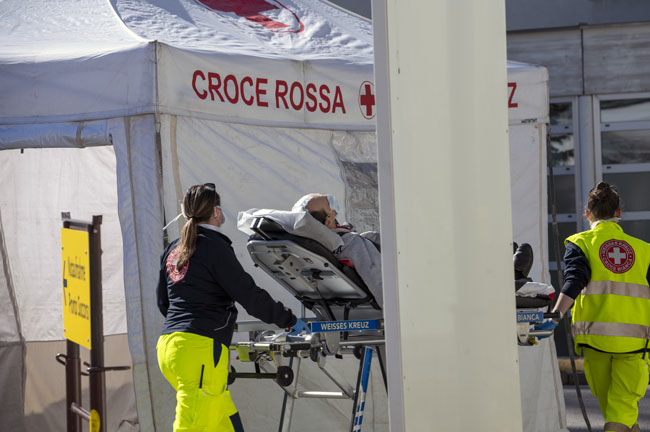 Milan, Italie, 17 mars 2020 : Des ambulanciers paramédics portant un masque de protection aident un homme atteint de coronavirus sur une civière à l’extérieur d’une tente de triage de l’hôpital.