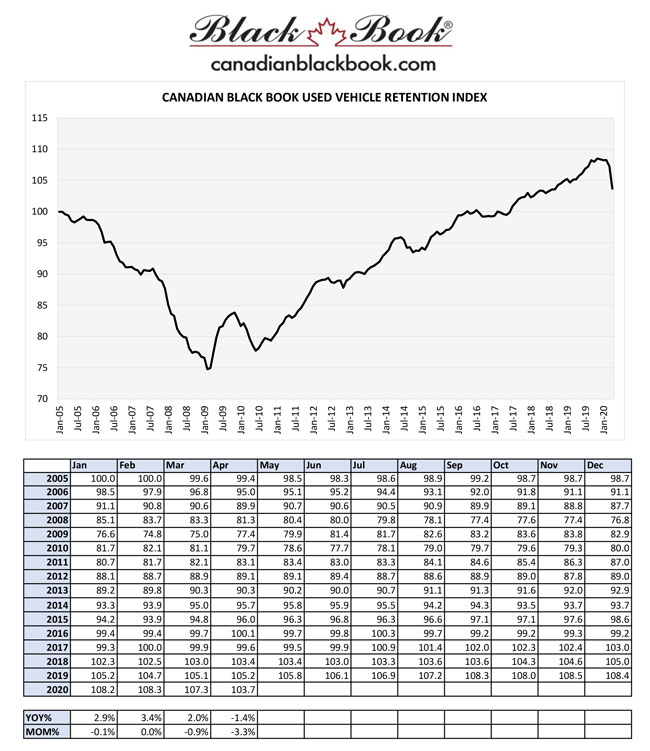 Nous prévoyons que, au cours des 3 à 9 prochains mois, les valeurs de revente chuteront de 17 points au total. Cela peut sembler important, mais nous avons déjà perdu 5 points en seulement 60 jours. Nous nous attendons à ce que davantage de records soient battus. Cela étant dit, ce ne sont pas toutes de mauvaises nouvelles. Lorsque l’économie se replacera, Canadian Black Book s’attend à ce que les valeurs connaissent une forte hausse et recouvrent une grande partie de ce qu’elles ont perdu en 2020.