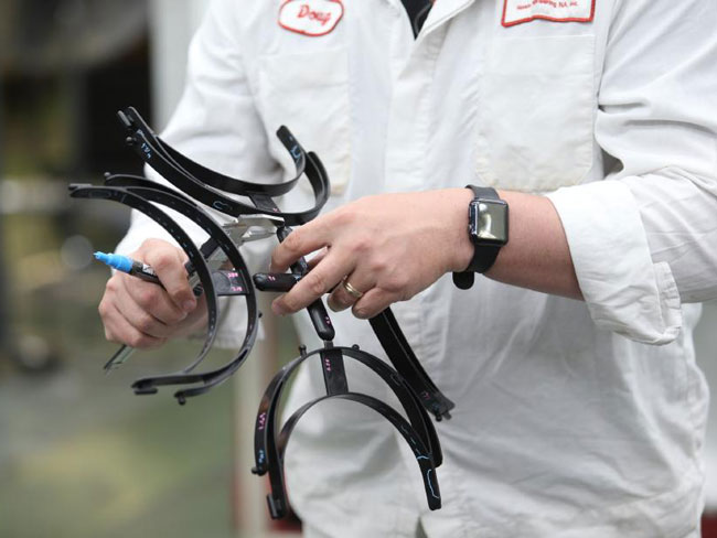 Un associé Honda vérifie le cadre des visières nouvellement produites pour s’assurer qu’il s’adapte bien aux utilisateurs.