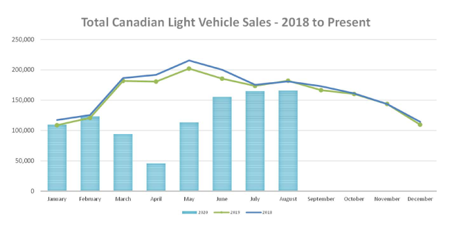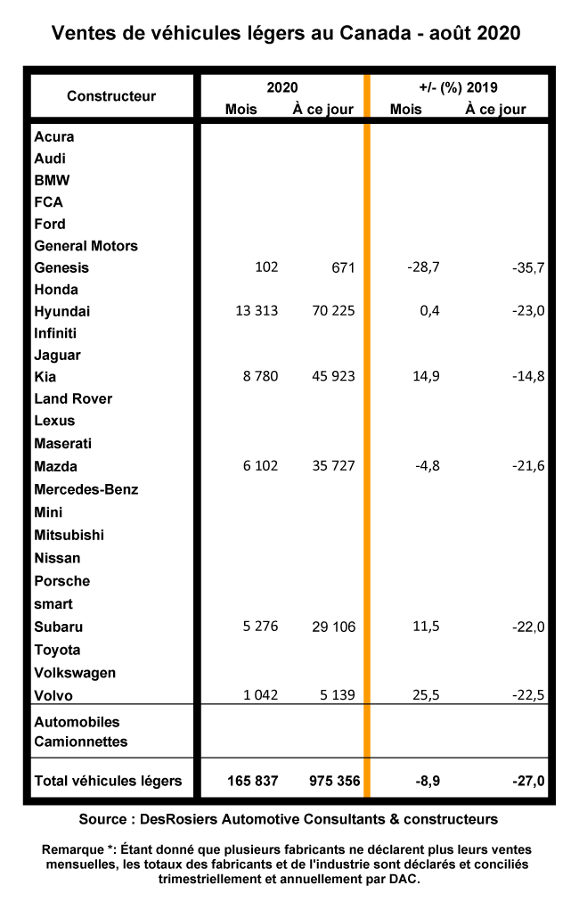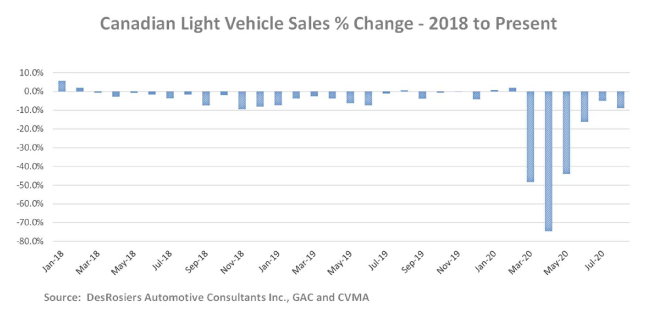 Après être revenues à moins de 4,9 % de la norme de l’année précédente en juillet, les ventes d’automobiles canadiennes en août ont diminué d’environ 8,9 % par rapport au même mois en 2019, selon les estimations de DesRosiers Automotive Consultants (DAC). Les ventes estimées à 165 837 véhicules pour le mois, par comparaison avec les 182 040 ventes en août 2019, se situent à environ 900 près du total de juillet.