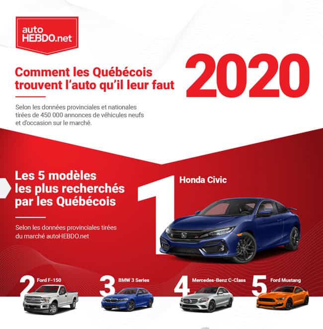 Selon la liste annuelle des véhicules les plus recherchés au Québec en 2020, la Honda Civic est toujours en tête. Ce modèle de véhicule demeure le plus recherché de la province pour une quatrième année consécutive. Le F-150, le Honda CR-V et le Toyota RAV4 sont également restés dans le Top 10. Les voitures de luxe représentent quant à elles 30 % de la liste au Québec. La BMW 3 Series est de retour en 3e position cette année, contrairement à la 7e position en 2019 et la Mercedes-Benz C-Class et la Porsche 911 sont nouvellement classées dans les 10 premières places du palmarès québécois. Finalement, Audi et BMW font partie des trois marques automobiles les plus recherchées sur autoHEBDO.net cette année.