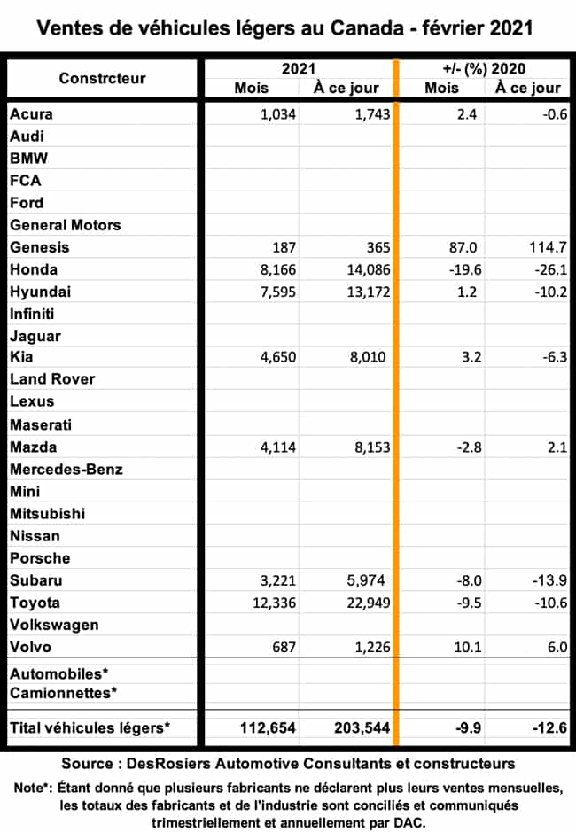 Selon DesRosiers Automotive Consultants (DAC), les ventes canadiennes totales de 112 654 véhicules neufs au cours du mois sont à la baisse de 9,9 % par rapport à février 2020. Ce sera le dernier mois où de telles comparaisons « normales » d’une année par rapport à l’autre sont possibles, étant donné que les ventes ont piqué du nez de 48 % en mars 2020, l’impact économique de la Covid-19 ayant balayé le pays avec la force d’un tsunami.