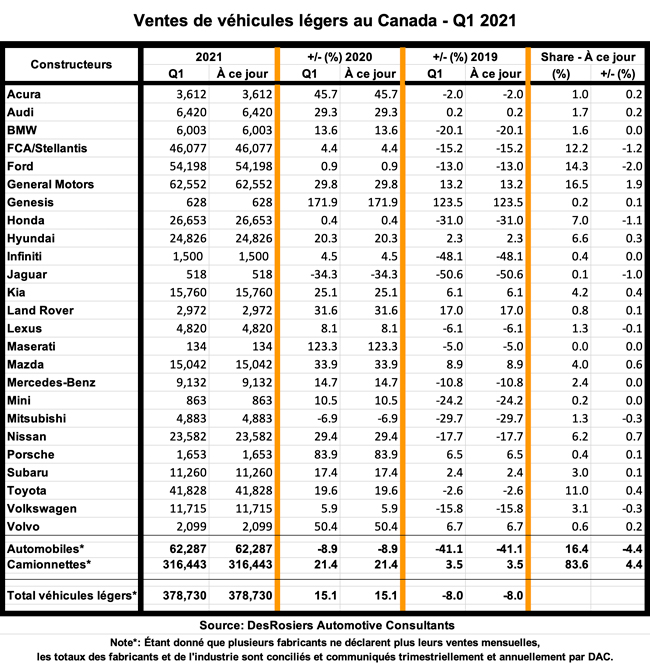 Par rapport à 2020, année où la quasi-totalité du pays a été fermée pour la deuxième moitié de mars, les ventes de cette année de 378 730 véhicules ont augmenté de 15,1 %, en grande partie grâce à une amélioration de 86,2 % pour le mois de mars lui-même, selon DesRosiers Automotive Consultants (DAC). Mais par rapport au 1er trimestre de 2019, les ventes de 2021 ont baissé de 8 % et elles étaient inférieures de 11,8 % à leur sommet historique de 2018.