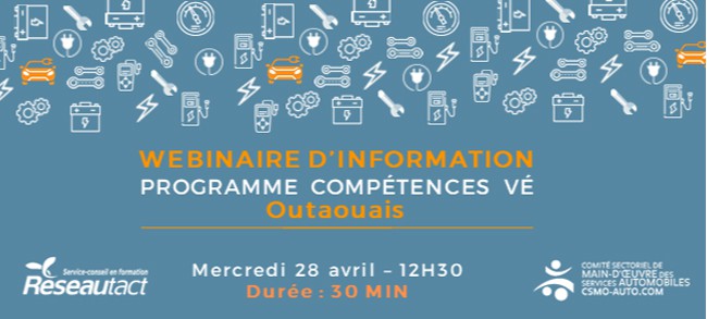 L’équipe du CSMO-Auto vous invite à un webinaire d’informations le 28 avril prochain. Cet événement virtuel a pour objectif de présenter le programme Compétences VE dans la région de l’Outaouais.