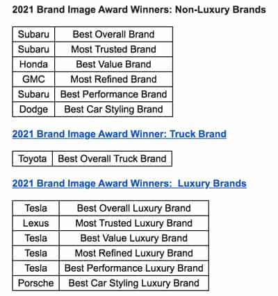 C’est sur la base des données annuelles de perception des acheteurs de voitures neuves que l’équipe du Kelley Blue Book a pu nommer les lauréats de ces prix Brand Image Awards 2021. Les catégories sont divisées en marque luxueuse, non luxueuse et les camions.