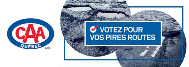 Pour une sixième année, le CAA-Québec lance sa campagne Les pires routes du Québec de CAA-Québec et recueille ainsi des milliers de votes des usagers. Il suffit d’aller sur Piresroutes.com d’ici le 17 mai prochain pour faire connaître votre opinion. CAA-Québec dévoilera les résultats au début juin.