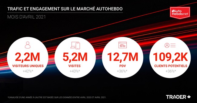 Toujours selon le Rapport de trafic et d’engagement des usagers AutoHebdo du mois d’avril 2021, on peut affirmer qu’il y a eu une augmentation de 43 % du nombre de visites, ce qui représente 5,4 millions de visites sur le marché automobile québécois. Une augmentation de 36 % des vues sur les pages des détails des véhicules a aussi été remarquée, ce qui signifie 12,7 millions de PDV vues. Plus précisément, il s’agit d’une augmentation de 30 % de PDV pour les véhicules d’occasion et de 33 % de PDV pour les véhicules neufs.