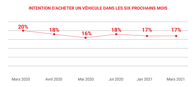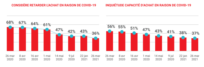 36 % ont indiqué qu’ils avaient l’intention de retarder l’achat de leur véhicule, contre un résultat de 68 % en mars 2020 37 % se disent inquiets de leur capacité à se payer un véhicule en raison de la COVID-19, contre un résultat de 56 % enregistré en mars 2020