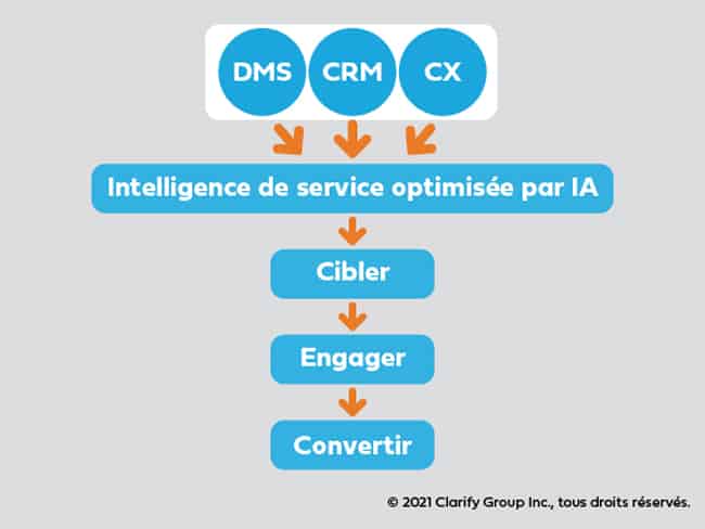Les solutions de concession axées sur l’IA utilisent les données que vous générez déjà — données de transaction DMS, données clients de votre CRM et commentaires CX — pour analyser les modèles et fournir des conseils à votre équipe BDC et à vos conseillers techniques afin qu’ils puissent interagir avec chaque client (et non avec le NIV ou la plaque d’immatriculation) de la bonne façon. Il n’est pas question de technologie; c’est ce que la technologie peut faire pour rendre vos processus de marketing et de traitement des clients plus faciles à exécuter, plus personnalisés et plus efficaces.