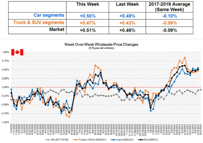 Le marché canadien de la vente en gros de véhicules d’occasion vient tout juste de connaître une autre performance impressionnante avec une augmentation hebdomadaire globale de + 0,51 %, ce qui représente une légère hausse par rapport à la semaine précédente + 0,46 %. Également, les augmentations hebdomadaires observées dans les segments des voitures et des camions/VUS étaient bien supérieures à la moyenne des augmentations de prix d’une semaine à l’autre. Les voitures ont de nouveau dominé le marché avec une forte hausse des prix (+ 0,55 %) qui étaient des hausses hebdomadaires plus fortes que la semaine précédente ; de même, les camions/VUS ont connu une autre légère hausse des hausses hebdomadaires à + 0,47 %.