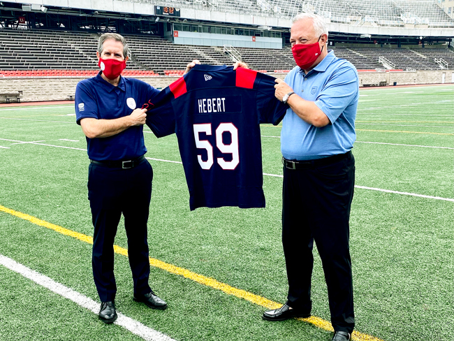 De gauche à droite : Mario Cecchini, président des Alouettes de Montréal, et Norman Hébert, président et chef de l’Exploitation de Groupe Park Avenue, au Stade Mémorial Percival-Molson, rendent officiel le partenariat de plusieurs saisons entre les deux organisations. – Crédit photo : Groupe Park Avenue