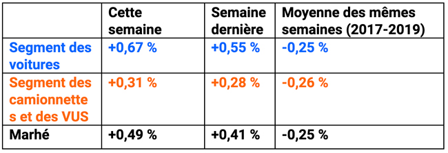 Le marché canadien de gros de véhicules d’occasion poursuit sa tendance positive, les 22 segments ayant connu une hausse de prix pour la semaine. Le manque d’inventaires continue d’être le principal moteur de ces hausses des prix de gros, les stocks de véhicules neufs et d’occasion continuant de diminuer. Les prix globaux ont augmenté de 0,47 % pour la semaine, avec le segment des voitures en hausse de 0,50 % et le segment des camionnettes/VUS en hausse de 0,45 %. Le segment des multisegments/VUS pleine grandeur a connu la plus forte augmentation (1,17 %), suivi des voitures compactes (1,10 %) et des voitures de luxe (0,83 %).