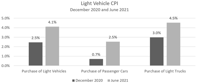 Un point à noter qui compense le chiffre positif des ventes au détail est l’impact des hausses de prix. Si l’on examine les données de l’IPC de juin, le prix d’achat des véhicules légers a augmenté de 4,1 % par rapport à juin 2020, soit une hausse supérieure à la hausse de 2,5 % observée en décembre 2020. L’inflation des prix, en particulier pour les véhicules d’occasion, aurait été encore plus élevée. Bien que le gouvernement canadien ne fasse pas de suivi, DAC indiquent que les hausses de prix des véhicules d’occasion au cours de la même période ont été supérieures à 20 %.